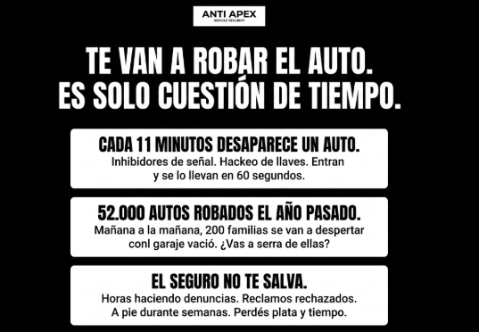 El año pasado, robaron un coche cada 11 minutos en Argentina. Ya no se trata solo de PBA o de Rosario, Santa Fé; los ladrones atacan en todas partes. La franquicia de tu seguro probablemente no te abone lo que debe. ¿Alquilar un coche mientras recuperan el tuyo (si es que lo recuperan)? ¡Fortuna!. ¿Faltas en el trabajo, denuncias policiales, estrés? Este candado cuesta lo suficiente para ahorrarte todo eso. La matemática es sencilla.